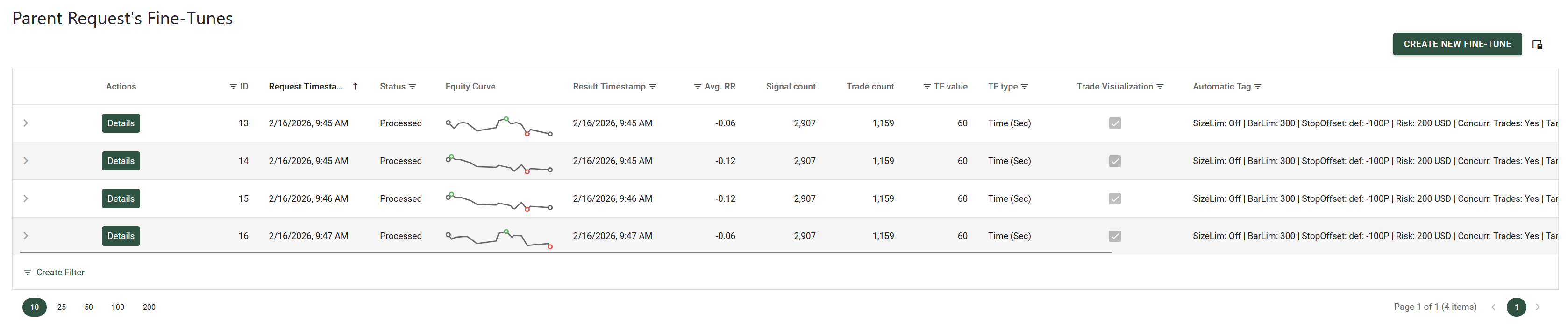 To crete a new Fine-Tune, click the CREATE NEW FINE-TUNE button in the top-right corner of the Parent Request's Fine-Tunes section.