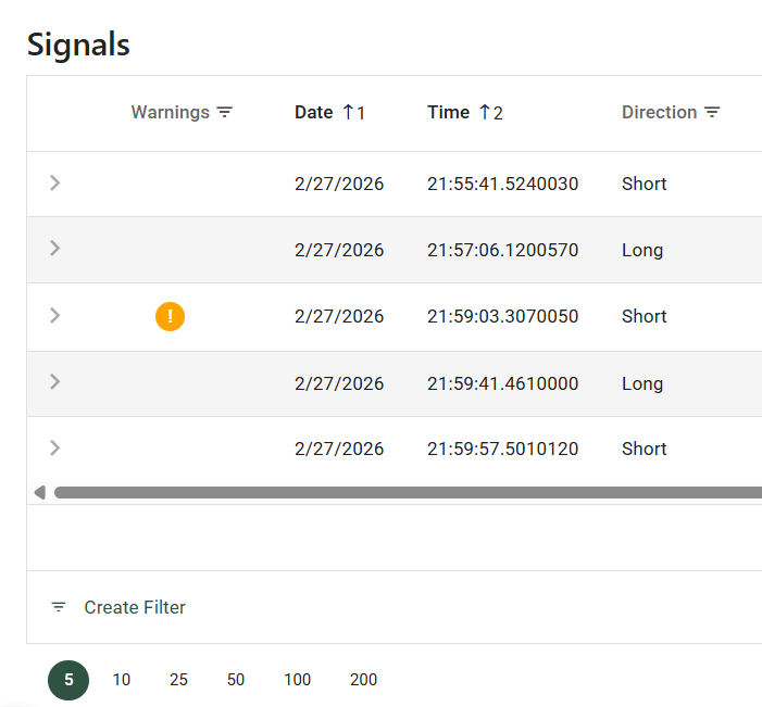 If an orange "!" mark appears in the Warnings column, it indicates that the Statistics Server could not reproduce the Signal with 100% precision. This is often due to the extreme complexity of slicing high-frequency tick data.