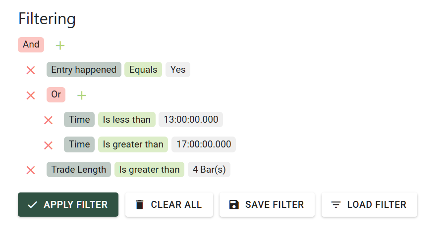 This is a critical feature for strategy refinement. By applying filters, you can get an immediate glimpse of how your strategy would have performed under specific conditions without needing to run a completely new simulation.